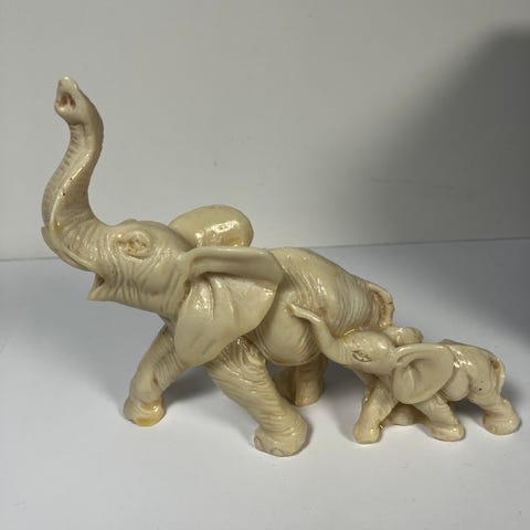 Selger en sjarmerende vintage figur av en svane med to svaneunger. Svanene er forbundet med en tynn, gullfarget lenke. Figuren er laget av et elfenbenslignende materiale (imitert elfenben) og har en fin, kremhvit farge.