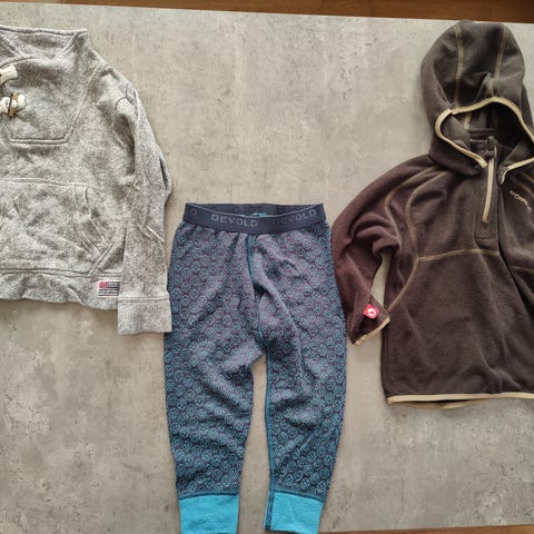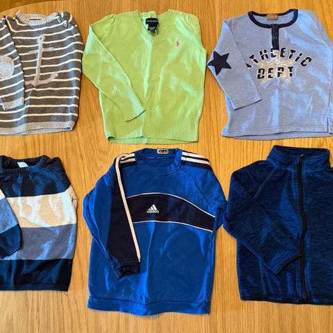 • Strikkelue i ett lag (str. 80–92) – 80 kr • Nike jakke (str. 85–92) – 300 kr • Genser med dinosaurer (Next, str. 82–92) – 50 kr • Joggebukse med dinosaur (str. 86–90) – 50 kr • Vinterstøvler fra Kavat (str. 22) – 350 kr