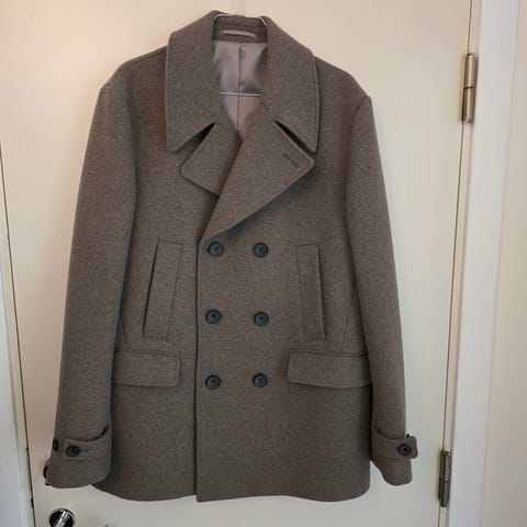 Mørk grå, tidløs og anvendelig. To lommer(+innerlomme med glidelås) 70% ull 30 % polyester.