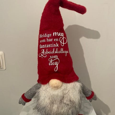 Julenisse med vinyltrykk på luen selges for 199kr. Nå