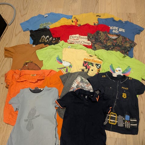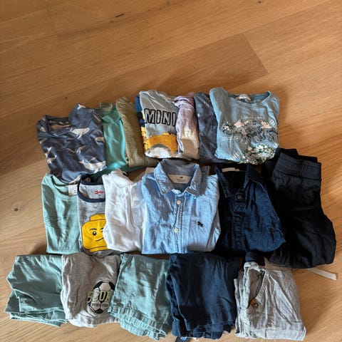 En treningsjakke, tre t-skjorter, 4 tynne gensere (den med bluey er noe flekkete), tre bukser, ett fleecesett + en ekstra genser, en vårjakke fra Norheim (110), en regnjakke fra Stormberg (110) og en regnbukse fra Reflex (110).