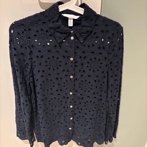 Behagelig bluse i blått og lett gjennomskinnelig stoff.