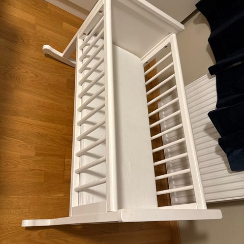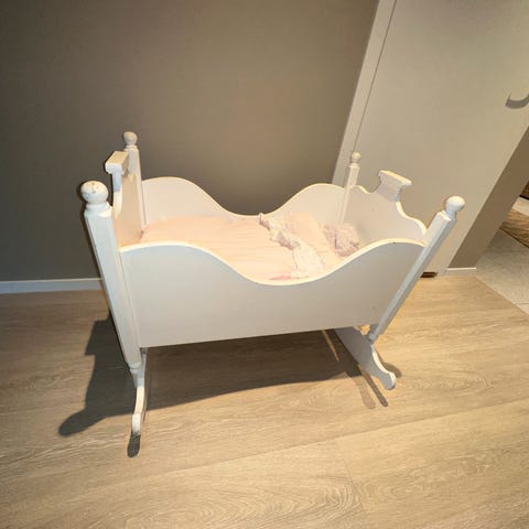 Troll Vugge barneseng i hvit tre. Sengen har en klassisk design med spiler på sidene og en buet fotende som muliggjør vugging. Egnet for nyfødte og små barn. Laget av solid tremateriale som gir stabilitet og holdbarhet.