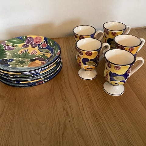 Te serviset i keramikk. Serviset består av 8 krus, 8 asjetter og tekanne. Serviset er av ukjent produsent. Det selges samlet. Pris kr 200,- + frakt. JEG SENDER