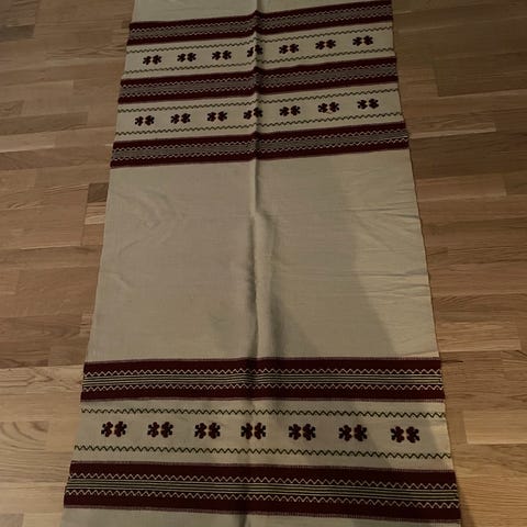 borddekorasjon bordduk duk håndlaget håndbrodert rektangulær rektangulært dekorativt gulvteppe veggteppe håndvevd vevd brodert broderi sengeteppe pledd rød hvit jul