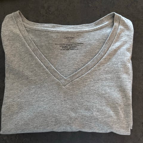 Calvin Klein T-skjorte i størrelse L for herre. Fargen er svart, laget av 100% bomull. T-skjorten har V-hals og er designet for en normal passform.