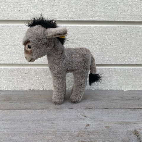 Leveres med sin originale knapp og tagg i øret, samt lapp på brystet.