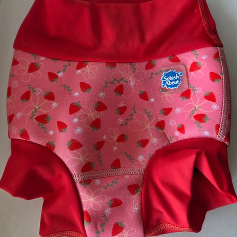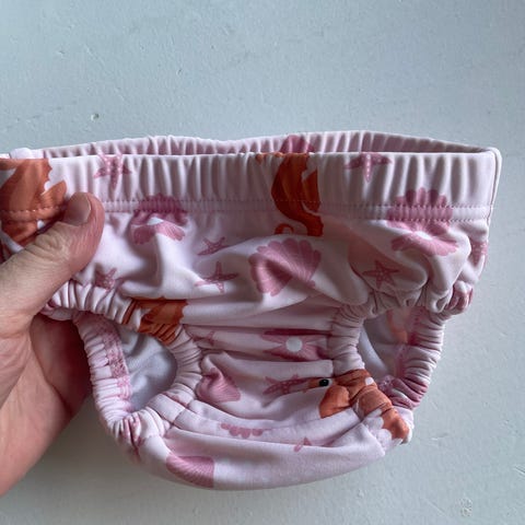 Badebleie til baby str S, 3-7 kilo. Brukt 4 ganger i svømmehallen, uten noen uhell i, før den ble i trangeste laget for en baby i god vekst her i huset.