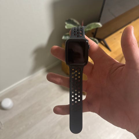 Apple Watch Nike Smartklokke med svart perforert sportrem. Klokken har en rektangulær skjerm og er designet for å være lett og komfortabel under trening. Remmen er laget av fleksibelt materiale med hull for bedre ventilasjon. Serie 6 med aluminium og ceramic case. 40 mm.