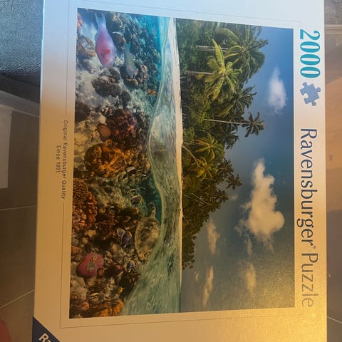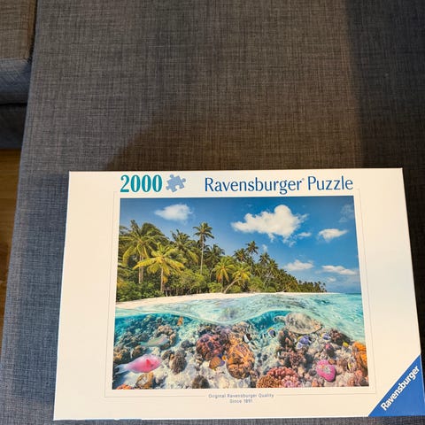 Ravensburger Puzzle med 2000 biter. Motivet viser et tropisk landskap med palmer, blomster og havn. Puslespillet er laget av pappmateriale og passer for voksne og eldre barn.