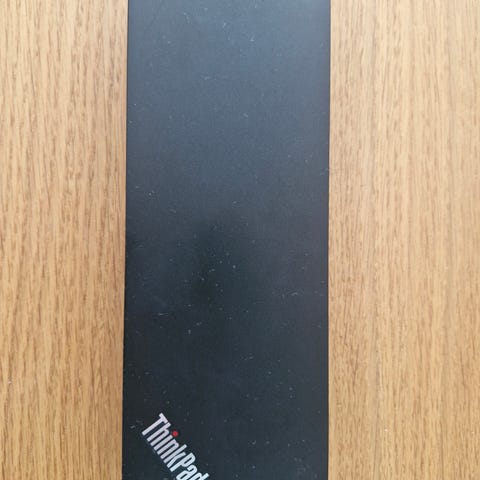ThinkPad Dokkingstasjon. Sort farge, designet for tilkobling av flere eksterne enheter til en bærbar PC, med flere porter for tilkobling av strøm, USB og skjerm.