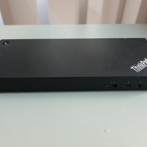 ThinkPad Dokkingstasjon. Sort farge, designet for tilkobling av flere eksterne enheter til en bærbar PC, med flere porter for tilkobling av strøm, USB og skjerm.