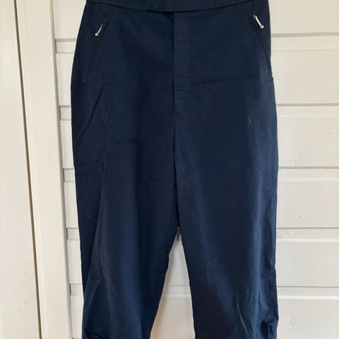 Marineblå knikkers i størrelse S. Det er én lomme med glidelås og snøring ved knærne på knikkersen. Den er fôret med et lyst stoff som sikkert er vindtett. Livevidden på buksen 68,5 cm., og det er mulig å legge ut,-se bilde! Lengden er 70 cm.