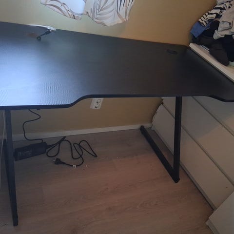 Pulten har lite bruksmerker og ser nesten ubrukt ut. Gamingmatten har noen flekker. Har deksel og koppholder som ikke er montert (fordi d er litt i veien).