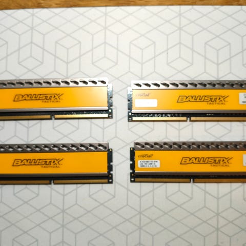 Crucial Ballistix RAM-moduler med totalt 16GB kapasitet, DDR4-type, svart farge. Passer til stasjonære datamaskiner som krever DDR4-minne.