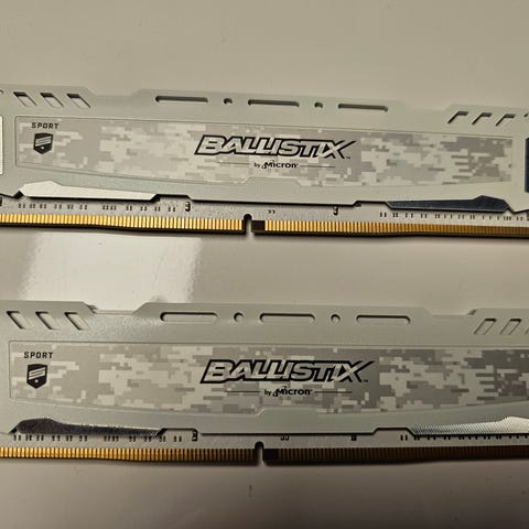 Crucial Ballistix RAM-moduler med totalt 16GB kapasitet, DDR4-type, svart farge. Passer til stasjonære datamaskiner som krever DDR4-minne.