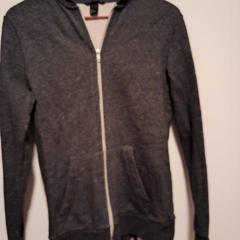 Den har glidelås foran og hette, egnet for hverdagsbruk.