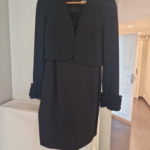 Størrelse 44, men litt liten for meg, så tror det passer bedre til en person str.42. Hvit vest med brokkade og svart skjørt med detaljer. Skjorte følger med. Kjøpt brukt, fikk ikke anledning til å bruke den selv pga at det var litt liten i størrelse. Har vasket skjorten og den har nydelig justeringssnore i metall i frontparti.