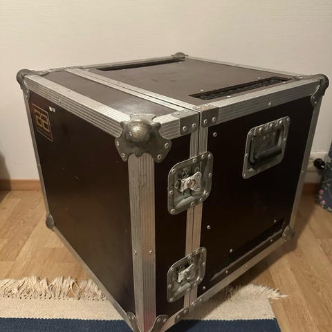 Rack kasse for 19" rack med hjul fra Rufo selges. Sideplater mangler, ellers i god stand. Strømuttak på innsiden virker. Rackskinner på begge sider. 54 cm bred, 51,5 cm dyp, 116,5 cm høy med hjul. Perfekt for studio, øvingslokale etc.