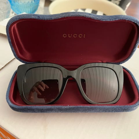 Selger et par Gucci GG0575SK solbriller med gullfarget ramme og mørke/grønne glass. Elegant, tidløs og klassisk modell fra Gucci – perfekt både til hverdag og mer pyntede anledninger.