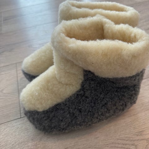 Kjempegode tøfler i 100% ull, i strl 39-40, fra merket Alwero. Som å ha på noen store, myke, varme sokker!