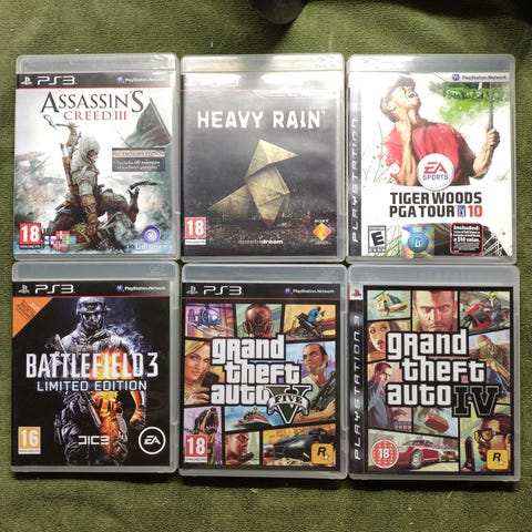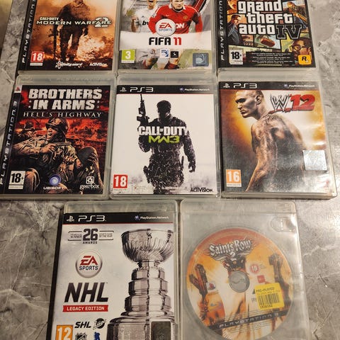 Playstation 3 spillpakke bestående av 7 spill: Gran Turismo 5, God of War III, FIFA 14, The Last of Us, Grand Theft Auto IV, Grand Theft Auto V, og Battlefield 3. Spillene dekker flere sjangre som racing, action, sport og eventyr.