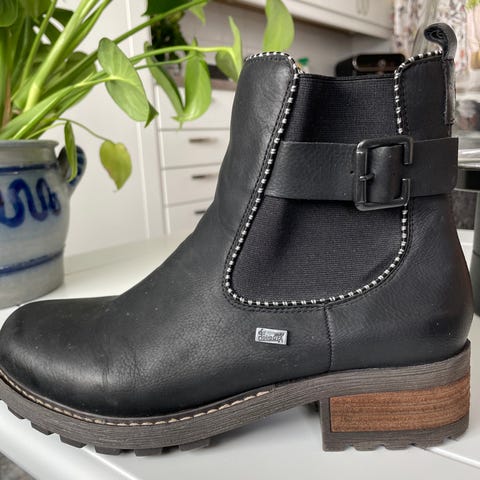 Rieker Hæler i rød skinn, størrelse 40 for damer. Skoene har dekorativ blomst på fronten og justerbar stropp med spenne. Sålen har mønster for bedre grep. Passer til bruk ved anledninger hvor hæler ønskes.