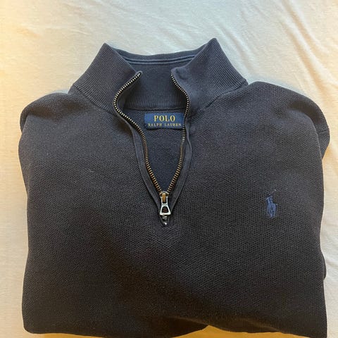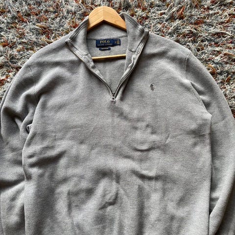 Ralph Lauren M genser i grå farge. Genseren har halv glidelås og er laget i et materiale som ser ut til å være bomull eller en bomullsblanding. Passer for menn i størrelse M. Genseren har et lite hull i stoffet på fremsiden, som vist på bildene.(derfor den selges så billig, annet en hull ingen andre skader.