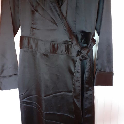 KappAhl morgenkåpe med nattkjole for kvinner i størrelse L, vinrød farge. Laget av satengmateriale med glans, har lange ermer og knyting i midjen. Morgenkåpen har dekorative detaljer rundt halsen.