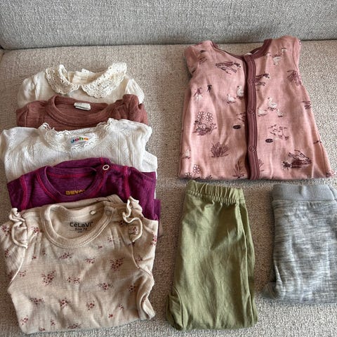 Liten ullpakke i str 68-74. Brukt og noe nupper. Den tynne dressen i lavelfarge har hull i sømmen langs ene leggen, men dette kan nok lett fikses av en som kan, vil og har tolmodighet 😅