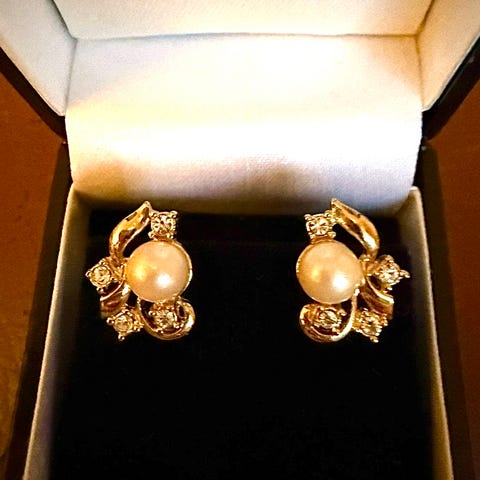 Dame ørepynt , et kjent merke kjøpt i 1990 (mulig Dior) laget av krystall og gullbelagt metall. Ørepynten har en detaljert design med flere små steiner og en kombinasjon av hjerte- og en litt regal form. Egnet til bruk som tilbehør for kvinner til en vintage kjole eller buksedrakt. Øredobbene er virkelig helt spesielle og har et originalt design. Skikkelig stash! Eller dyr bling! Det er klips. Så om du lengter tilbake til 80- tallet, så er disse perfekte.