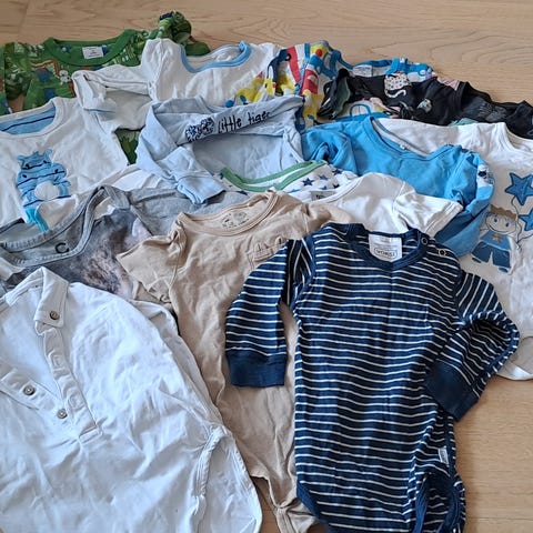 Diverse klær, ubrukt med lapper på selges samlet for kr 349. Tøff olajakke fra HM i størrelse 74 (pris 149), tøff Newbie Blå Olashorts med seler og lommer og trykknapper i skrittet og knapper i livet og på selene i str. 74 (pris 199) og 2 kortermede bodyer fra Newbie i str. 74 med fint mønster (pris for en kr 129). Alle Klærne er i 100 % bomull.