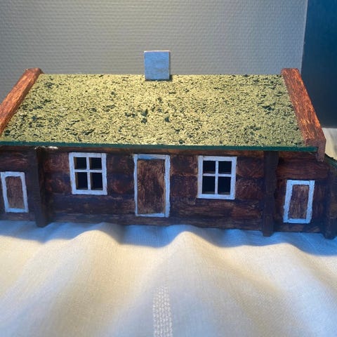 Selger et unikt og sjarmerende håndlaget hus i tre, malt i tradisjonelle farger (rødt med hvite og mørke detaljer).
