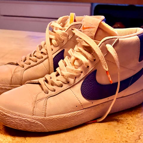 Nike Blazer Mid høye sneakers i størrelse 39. Skoene er hvite med svarte detaljer og laget for fritid. Materialet er en kombinasjon av skinn og tekstil. Skoene har snøring og en gummisåle med mønster for grep.