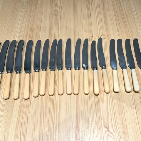 To smørekniver fra Coline. Noe smått slitasje på skaft og blad (ikke rust, men noe misfarging). Ikke vasket i oppvaskmaskin, knivene er gode på å spre ut smør etc.
