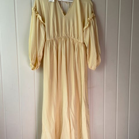 Floyd galla/festkjole i flott gul farge, romslig i str. Kjolen har strikk i livet så passer størrelse XS/S. puffede ermer og som sagt en elastisk midje. Materialet er lett og behagelig, veldig fin passform.