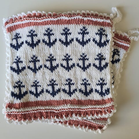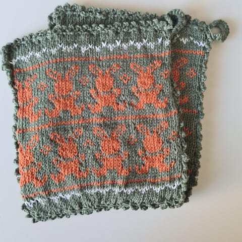 Hjemmestrikket grytekluter er ny og ubrukt.