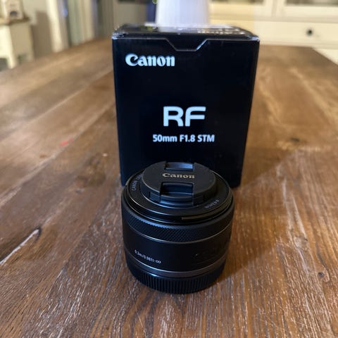 Canon RF 50mm f/1.8 STM objektiv med stillegående STM-motor. Objektivet har en blenderåpning på f/1.8 som gir mulighet for skarpt fokus og uskarp bakgrunn. Designet for skarp og stille fokusering, egnet for fotografering av stillbilder og film. Kompakt og lett konstruksjon med Super Spectra-belegg for å redusere gjenskinn og sikre kontrast.