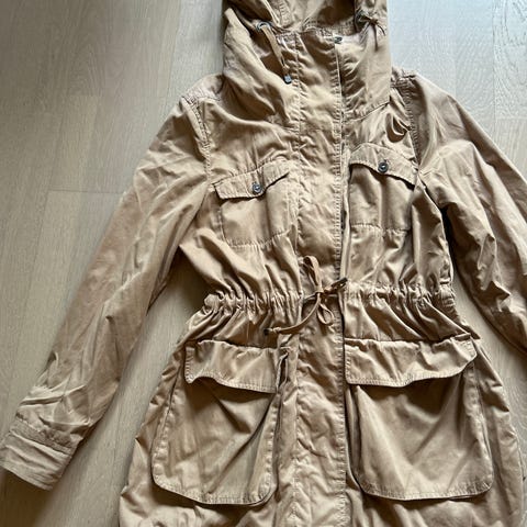 KappAhl kåpe i størrelse M for kvinner. Kåpen er grønn og har en hette. Den har snøring i midjen for justering av passform. Fin som vår/ høstjakke.