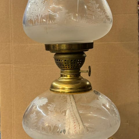 Vakker, antikk parafinlampe til sals. Vaseforma fot i majolika på støypt messingfot. Malt motiv av polykrome blomar. Gamal reparasjon ((sjå bilde). Bordmodell. Oljehus i glas. Fot i Christal Superieur. Høgde 56 cm. Kjøpt i si tid på Blomqvist. Me veit ikkje korleis funksjonaliteten er. Må hentast på Geilo.