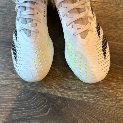 Adidas Predator fotballsko i størrelse 43 1/3. Skoene har en hvit og grå fargekombinasjon med detaljer i gult. Materialet består av tekstil og syntetiske komponenter. Designet for fotballspillere med fokus på passform og ballkontroll. Uten lisser, kun strikk. Sitter godt på foten.