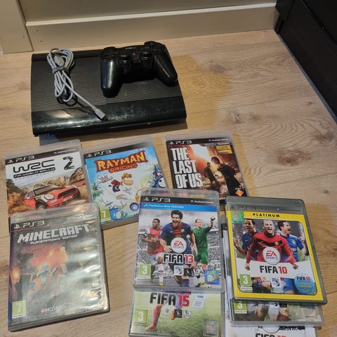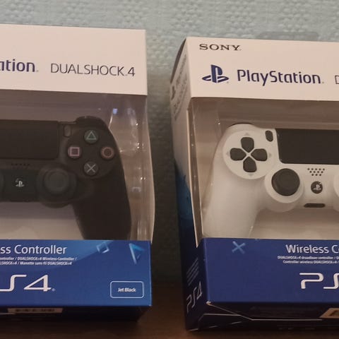 Sony Playstation 4 spillkonsoll med en trådløs kontroller. Konsollen har en svart farge og standard størrelse for Playstation 4. Passer til spill og underholdning for hjemmebruk.