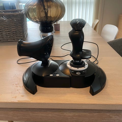 Presis, komfortabel og solid joystick med throttle, perfekt for fly- og romsimulatorer. Justerbar motstand, mange programmerbare knapper og ergonomisk design. Lite brukt og ser ut omtrent som da den var ny.