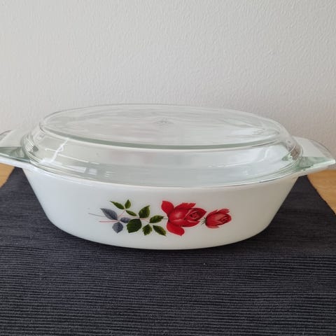 JAJ Pyrex retro ildfast 2 stk, laget av hvitt glass med blomsterdekor. Skålene har håndtak for enkel håndtering og kan brukes til servering av mat. Designet med floral mønster i rødt og grønt. Selges samlet