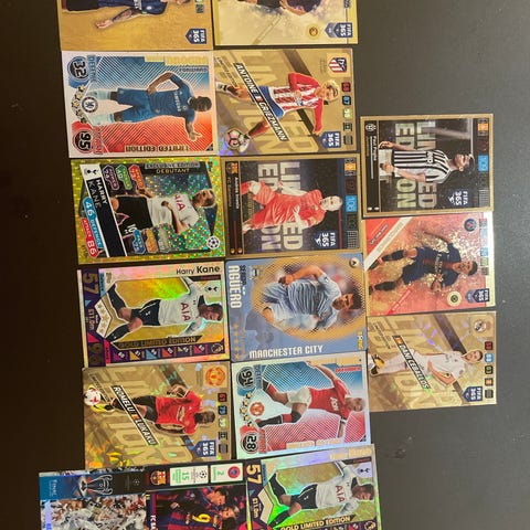 Samling av Premier League fotballkort med ulike spillere og lag. Kortene varierer i design og inkluderer både vanlige og spesialkort. Egnet for samlere og fotballinteresserte. Har en del kort så om du er interessert i et eller flere kort er det mulig jeg har det. Kom gjerne med bud
