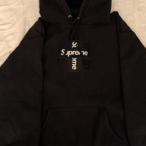 Selger en lite brukt navy blå Supreme cross box logo hoodie fra FW20