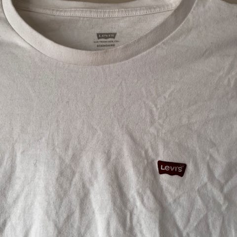 Levi's T-skjorte i størrelse L. T-skjorten er hvit med regnbuefargede striper på ermene og laget av bomull.
