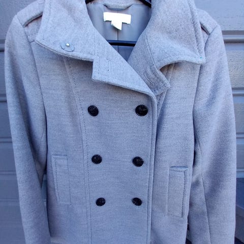 Design by Si jakke i størrelse S for ungdom/kvinner. Jakken er grå og har dobbeltradet knappestilling. Materialet er ull og fremstår som tykk og egnet for utendørs bruk. Glatt fór på innsiden gjør den vindtett og medvirker til å holde på varmen. Den kan prøves/hentes på Søråshøgda.