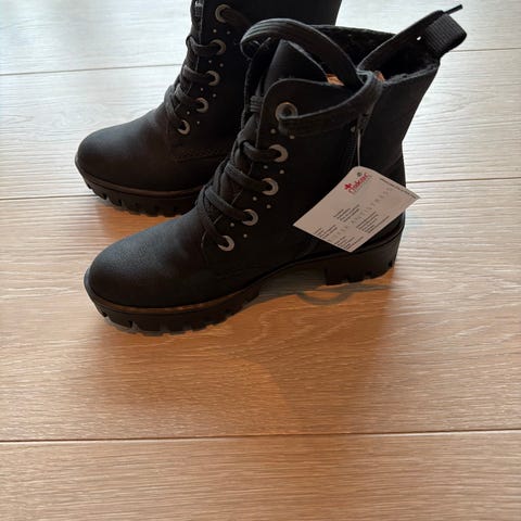 Rieker Vinterstøvler i størrelse 36 for dame (litt små i str). Støvlene er blå med hvite lisser og har en foret innside for ekstra varme. Yttersålen er hvit med mønster for godt grep. Materialet kombinerer tekstil og syntetisk for komfort og isolasjon.