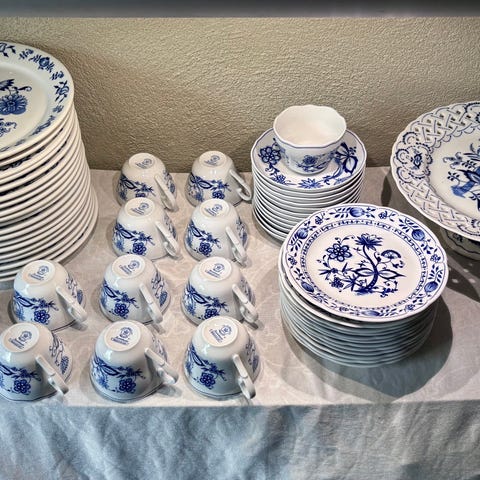 Jeg har et vakkert sett med kopper, underfat og desserttallerkener. Totalt 35 stykker fordi en kopp mangler.